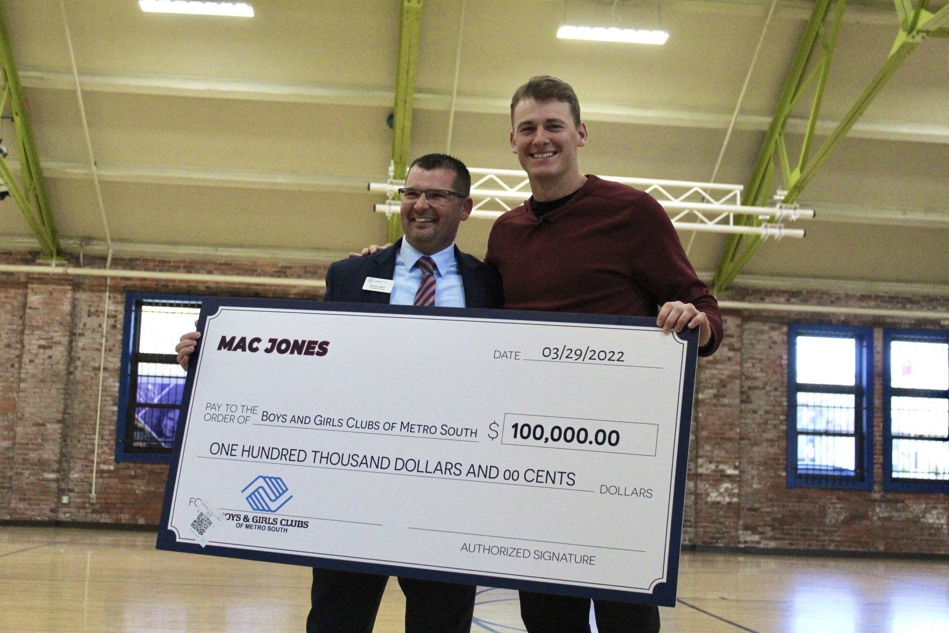 In addition to his time, Jones also had a few special gifts. He handed out some footballs, and also presented the Boys and Girls Club with a check for $100,000.